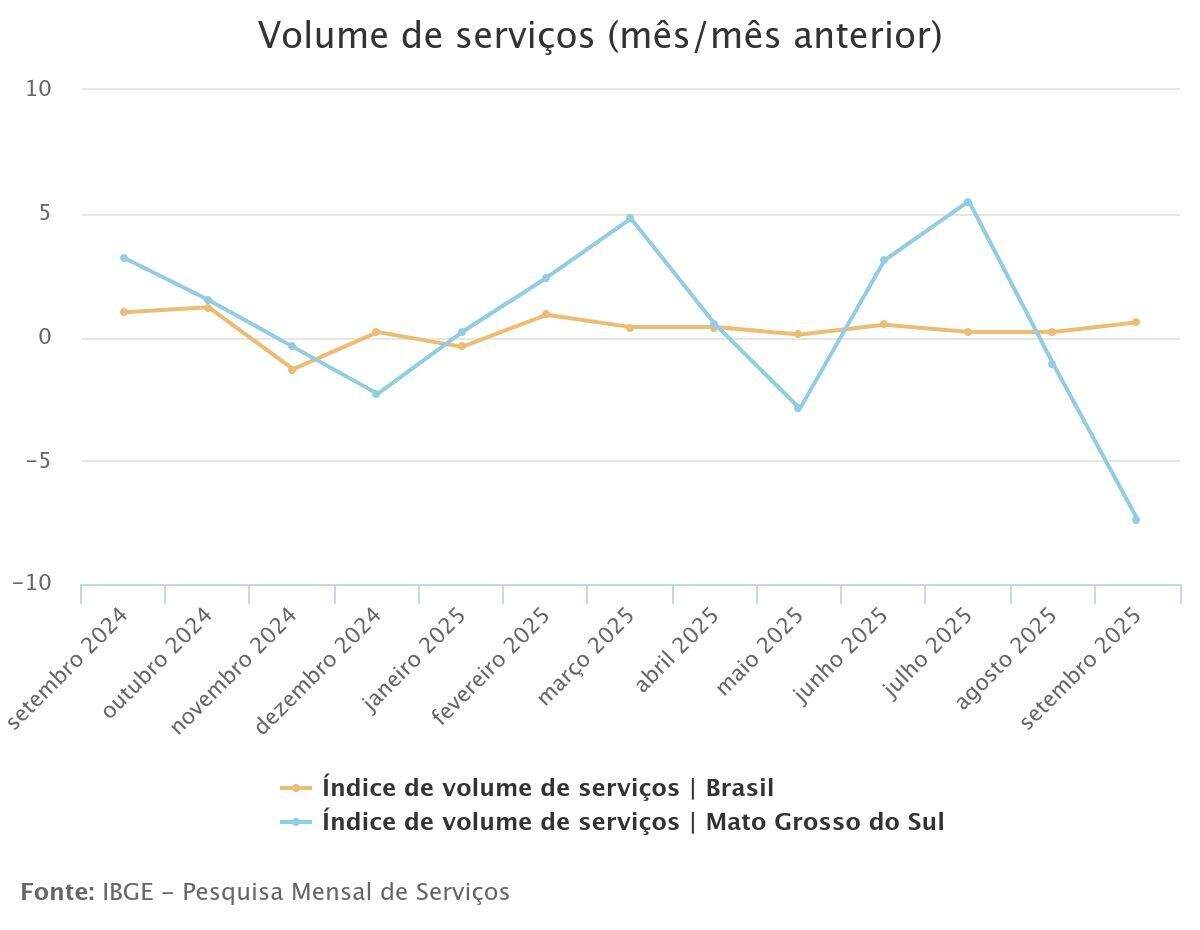 O setor de serviços de Mato Grosso do Sul registrou queda de 7,4% em setembro, a maior retração entre todas as unidades da federação, conforme dados da Pesquisa Mensal de Serviços do IBGE. Esta foi a segunda queda consecutiva do Estado, após recuo de 1,1% em agosto.Apesar do desempenho negativo mensal, o Estado mantém resultados positivos em períodos mais longos, com alta acumulada de 5,3% no ano e 2,3% nos últimos 12 meses. Em contraste, o setor de serviços nacional cresceu 0,6% em setembro, marcando o oitavo resultado positivo consecutivo.