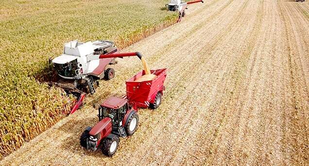 Colheita mecanizada de milho usando uma colheitadeira combinada e um trator com reboque graneleiro (Foto: Semadesc)