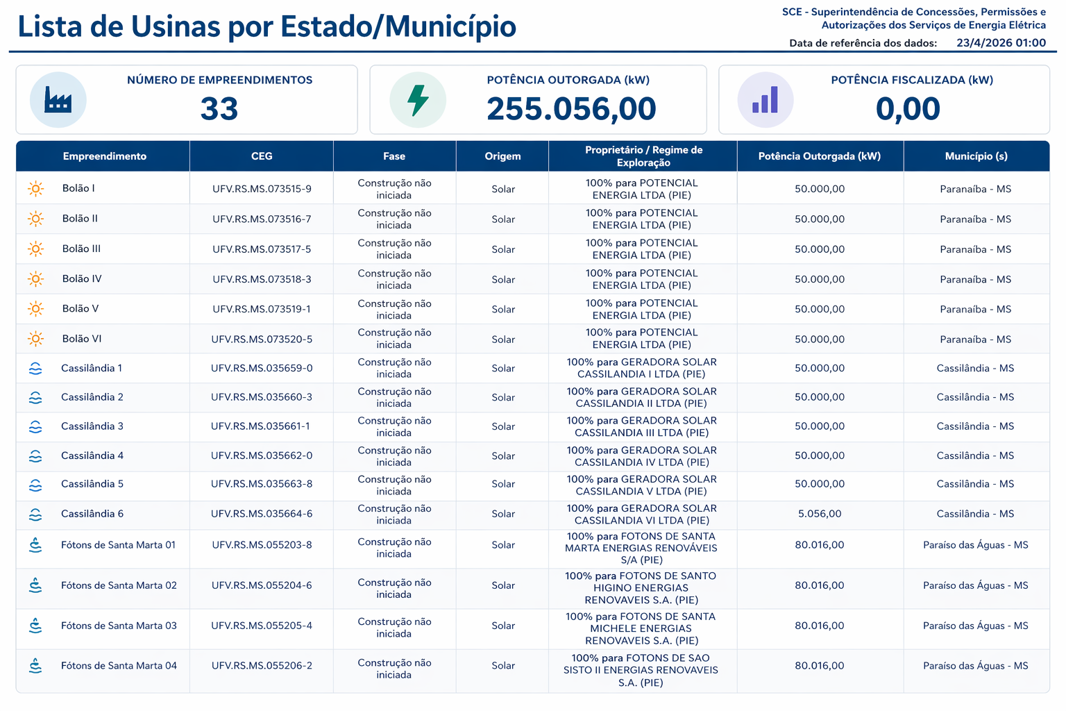 Segundo dados da Absolar (Associação Brasileira de Energia Solar Fotovoltaica) enviados ao Campo Grande News, o estado soma cerca de 1,6 GW em outorgas para novas usinas solares, com base em informações da Aneel (Agência Nacional de Energia Elétrica). Esses pedidos refletem o interesse do mercado, mas não garantem a execução dos projetos, que podem ser suspensos por entraves regulatórios, limitações na rede ou mudanças nas condições econômicas.