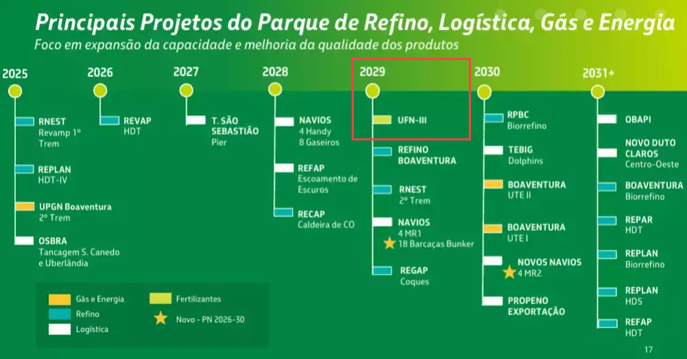 A empresa reforça que, além da UFN-III, o foco para os demais ativos do setor como as plantas Fafen-BA, Fafen-SE e Araucária Nitrogenados será a continuidade operacional, sem previsão de novos grandes aportes no ciclo 2026-2030.