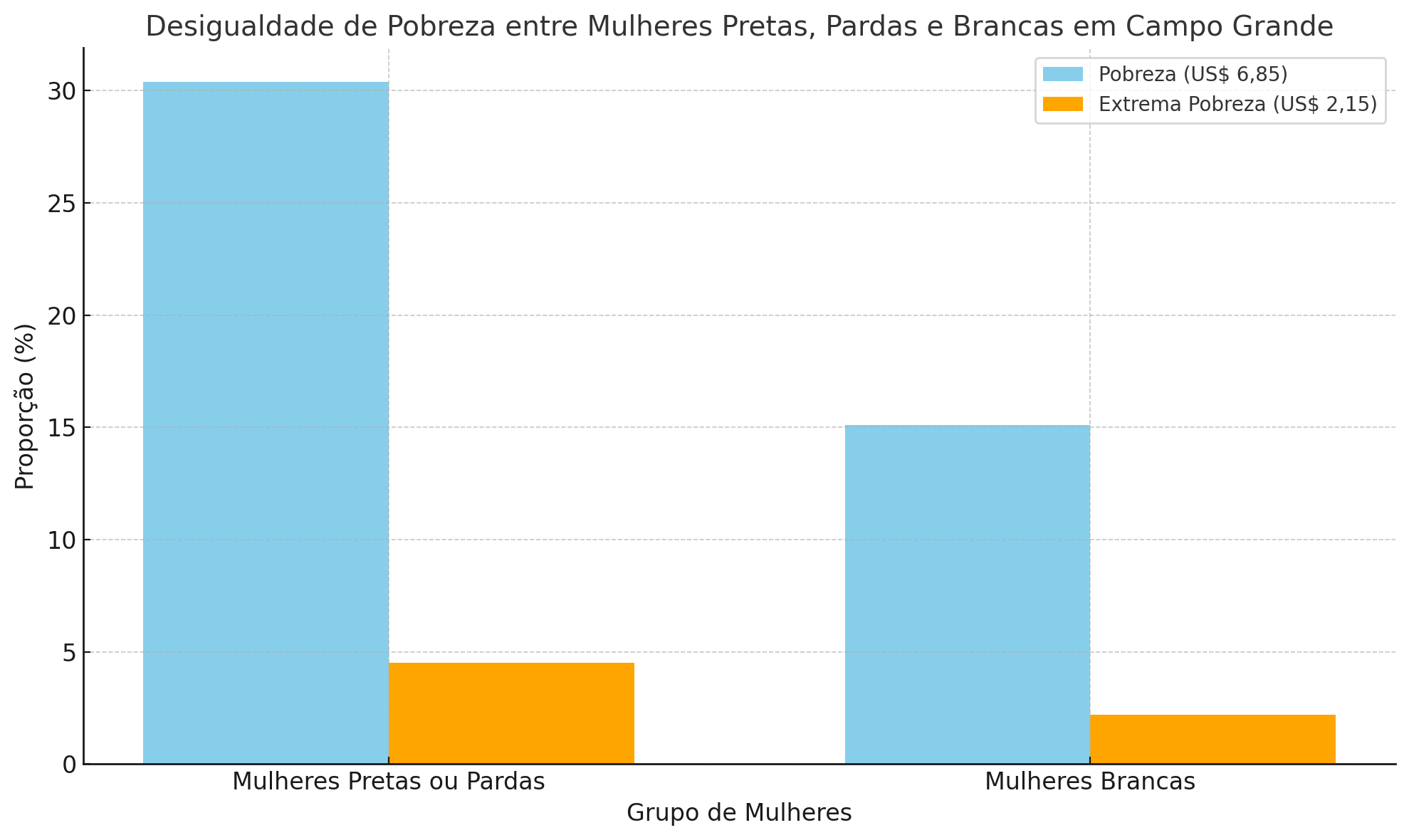 Os dados também mostram que mulheres pretas e pardas são mais afetadas pela pobreza. Elas representam uma maior proporção de pessoas na pobreza e na extrema pobreza em Campo Grande, o que revela a desigualdade racial e de gênero ainda presente na cidade.