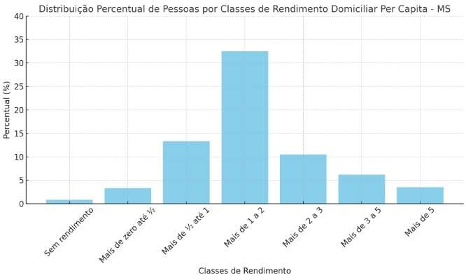 Além disso, 13,3% da população de Mato Grosso do Sul está na faixa de rendimento entre meio e 1,5 salários mínimos, o que indica que a pobreza ainda afeta uma boa parte da população, especialmente nas classes mais baixas.
