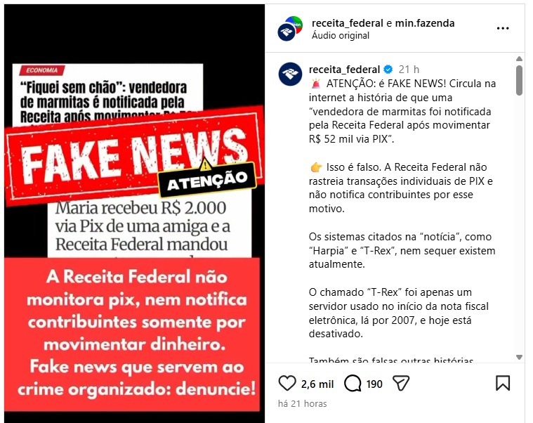 A Receita alerta que esse tipo de conteúdo costuma gerar medo e pode abrir espaço para golpes. “Esse tipo de desinformação causa insegurança e pode atender a interesses de organizações criminosas”, informou o órgão.