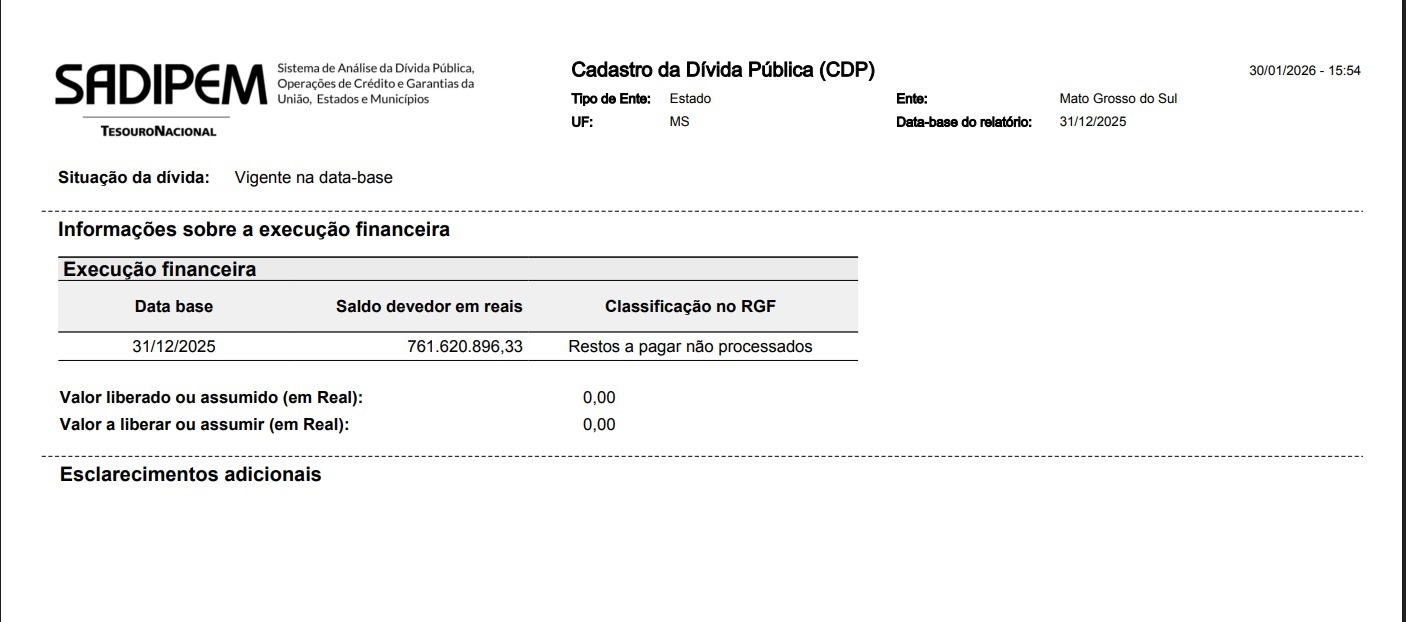 As contas fiscais de Mato Grosso do Sul fecharam 2025 com R$ 761,6 milhões inscritos em restos a pagar não processados, o equivalente a 3,3% das despesas totais do Estado, que somaram R$ 23,4 bilhões. Os dados constam do Sadipem (Sistema de Análise da Dívida Pública, Operações de Crédito e Garantias da União, Estados e Municípios) do Tesouro Nacional.