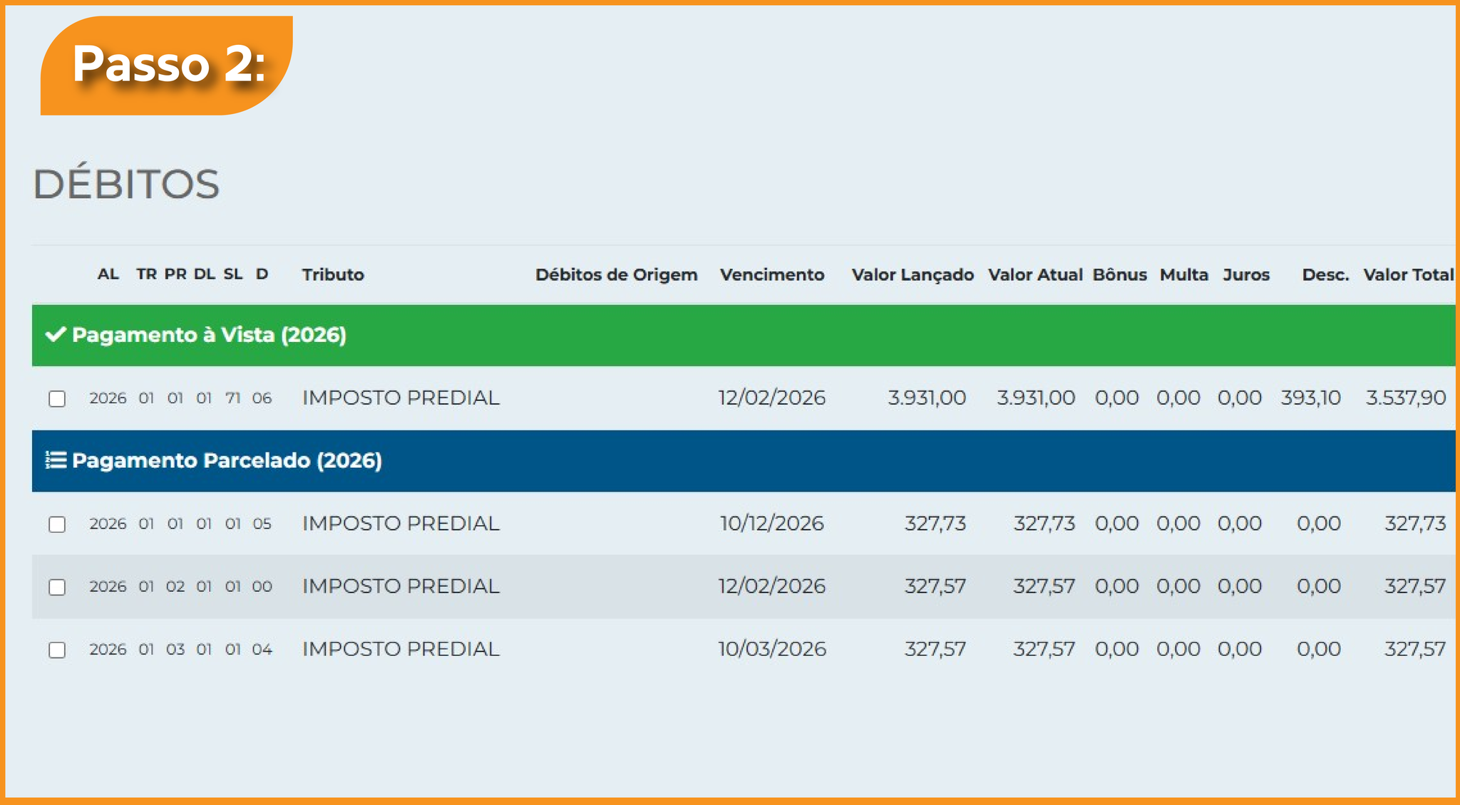 No espaço vazio, o contribuinte deve colocar o número da inscrição do imóvel e acessar o novo boleto. Ele aparecerá com as opções de pagamento à vista ou parcelado, para que a pessoa escolha a forma e baixe o boleto para pagamento.