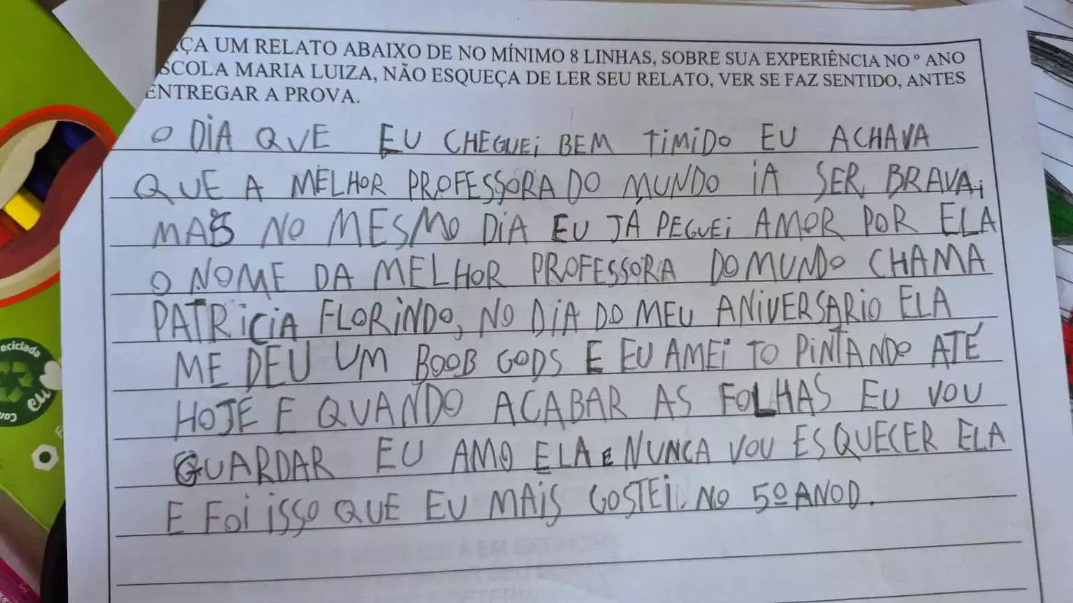 Antes, era um menino "muito agitado, bagunceiro e que tinha comportamento um pouco agressivo" na sala, segundo Patrícia, mas que mudou desde que começou a receber incentivos e mais atenção. Ele até expressou um agradecimento numa das últimas avaliações aplicadas pela professora.