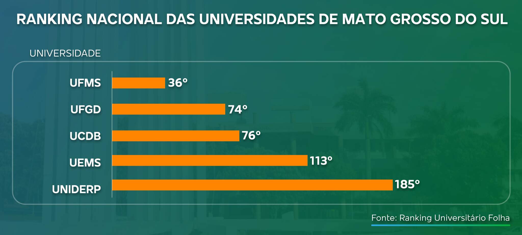 A UFMS mantém a 36ª posição no Ranking Universitário Folha, com nota geral de 74,28 pontos. Entre as cinco instituições sul-mato-grossenses avaliadas, destacam-se também a UFGD (74º lugar), UCDB (76º), UEMS (113º) e Uniderp (185º). No cenário nacional, a USP lidera o ranking, seguida pela Unicamp e UFRGS. A avaliação, que contemplou 204 universidades públicas e privadas, considera indicadores como ensino, pesquisa, mercado, inovação e internacionalização.