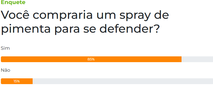 A possibilidade de usar um item de defesa pessoal tem forte apoio entre os leitores. Em enquete do Campo Grande News, 85% afirmaram que comprariam um spray de pimenta para se defender, enquanto 15% disseram que não utilizariam o dispositivo.