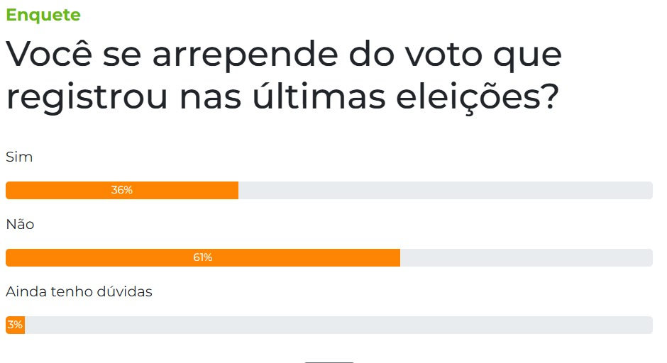 A maioria dos leitores afirma não se arrepender do voto registrado nas últimas eleições, conforme enquete realizada nesta terça-feira (10). Em contrapartida, 36% disseram ter repensado a escolha e outros 3% ainda estão em dúvida.