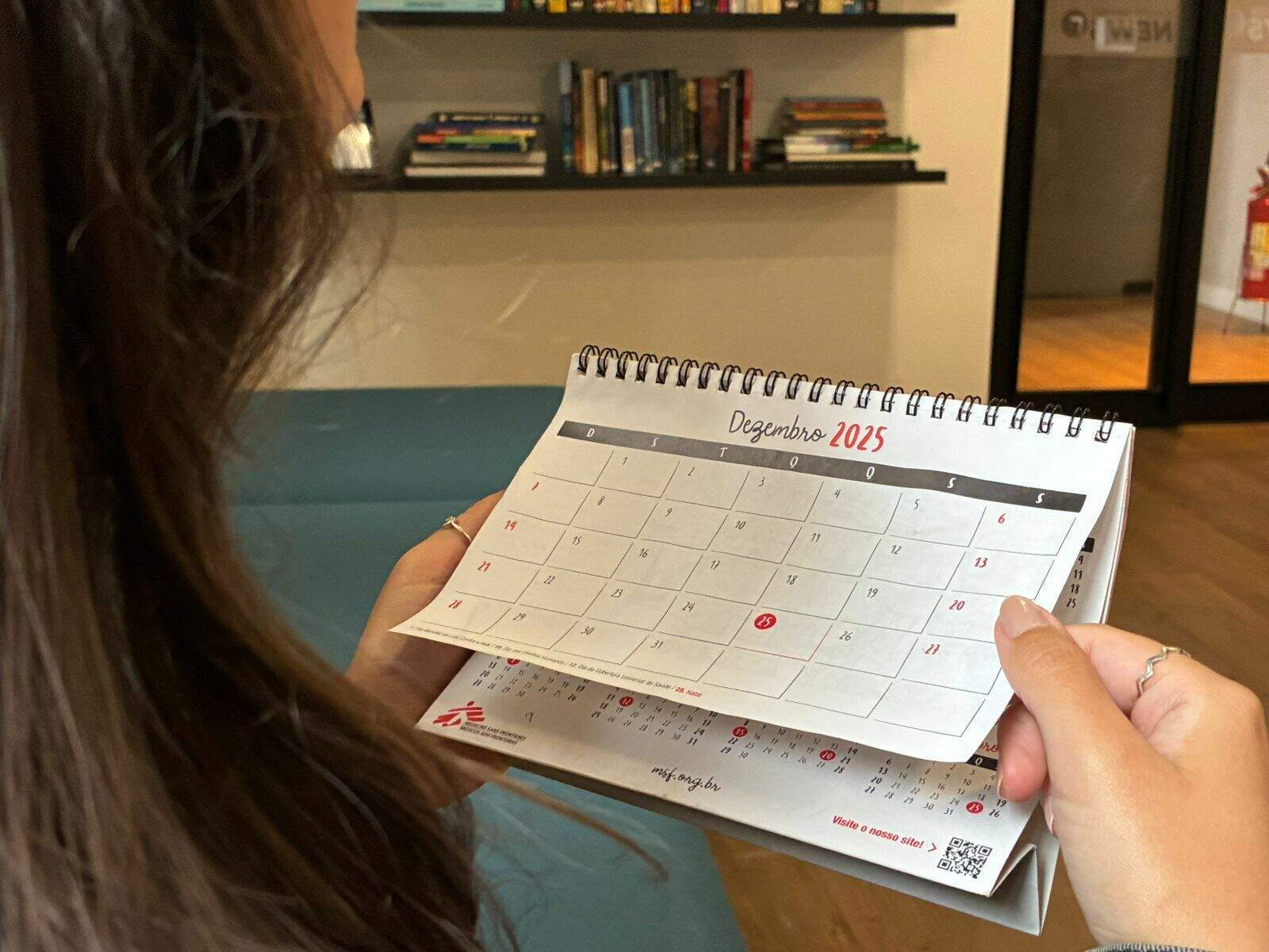 Mulher segurando calendário de 2025 (Foto: Clara Farias)