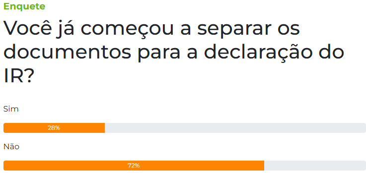 Mesmo com o prazo se aproximando, a maioria dos leitores ainda não começou a organizar a papelada para a declaração do Imposto de Renda. Enquete do Campo Grande News de quinta-feira (19) mostra que 72% dos participantes ainda não separaram os documentos necessários para prestar contas à Receita Federal. Outros 28% afirmaram que já deram início à organização.
