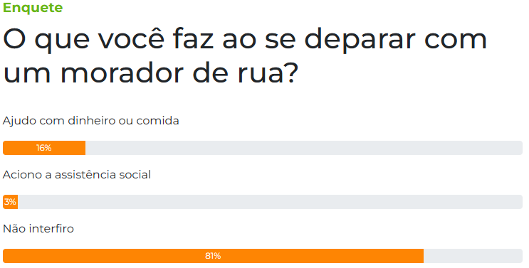 O resultado da enquete mostra, portanto, que a maior parte da população prefere se manter distante, ainda que exista um grupo significativo que mantém gestos de solidariedade. O fato de a opção por acionar a assistência social ter recebido apenas 3% dos votos indica também uma baixa confiança nos serviços públicos para lidar com a questão. Em síntese, os moradores de rua se multiplicam, mas o olhar da sociedade oscila entre compaixão, medo e rejeição, em um cenário em que faltam políticas efetivas e respostas coletivas para enfrentar o problema.