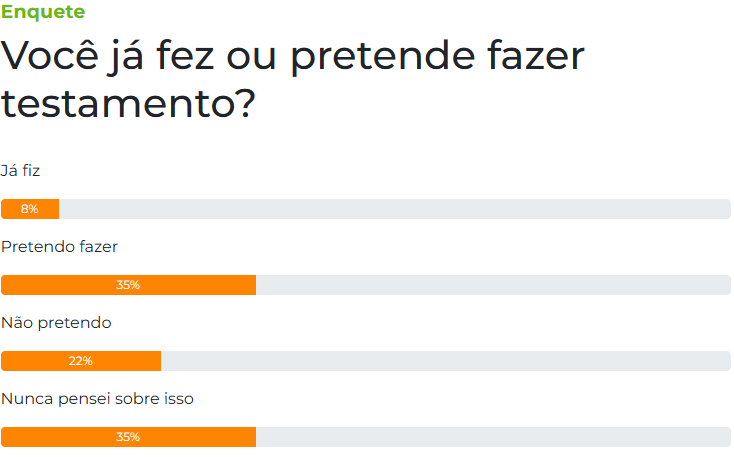 A maioria dos leitores do Campo Grande News ainda não formalizou um testamento, mas parte significativa pretende tomar essa decisão. Na enquete publicada neste domingo (15), 35% responderam que pretendem fazer o documento e outros 35% admitiram que nunca pensaram sobre o assunto. Já 22% afirmaram que não pretendem elaborar testamento, enquanto apenas 8% disseram que já fizeram.