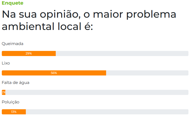 Para 56% dos leitores, o lixo é hoje o maior problema ambiental de Campo Grande. Em seguida aparecem as queimadas, com 29%, depois a poluição, com 13%, e por último a falta de água, citada por 2%.