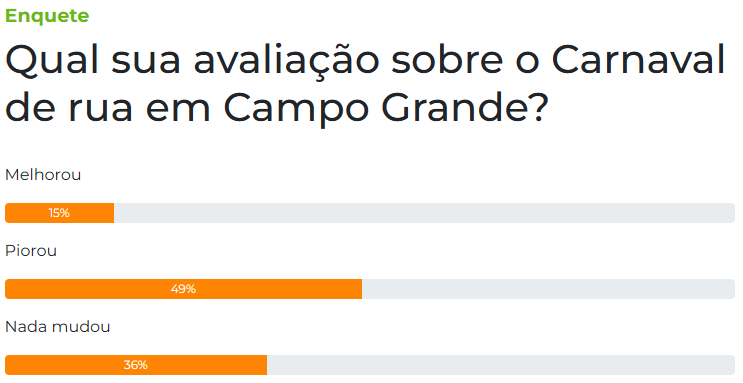 Para 49% dos leitores, o Carnaval de rua em Campo Grande piorou. Outros 36% avaliam que nada mudou e 15% consideram que a festa melhorou, segundo enquete do Campo Grande News encerrada nesta terça-feira (17), último dia oficial da programação na Esplanada Ferroviária.