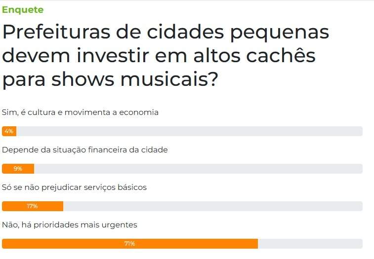 O resultado da enquete do Campo Grande News mostrou que 71% dos leitores não concordam que prefeituras de cidades pequenas invistam altos cachês em shows. Eles acreditam que há prioridades mais urgentes.