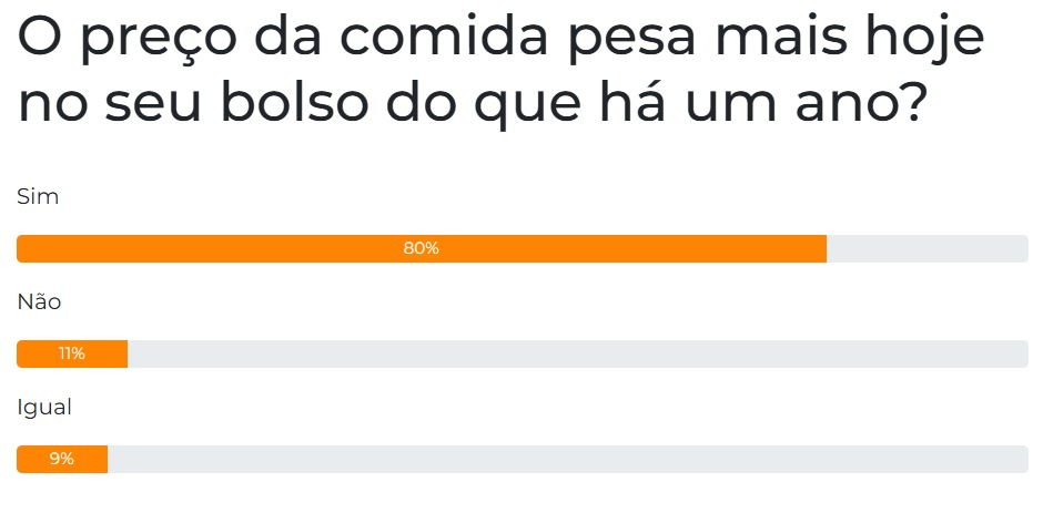 Para 80% dos participantes da enquete do Campo Grande News desta quarta-feira (7), o preço da comida tem pesado mais no orçamento do que há um ano. Outros 9% dos leitores afirmaram que o impacto permanece o mesmo.