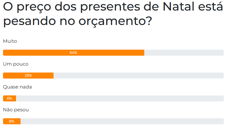 Enquete do Campo Grande News sobre o impacto do preço dos presentes de Natal mostra que a maioria sente o peso no orçamento: 64% dos participantes afirmaram que os preços estão pesando “muito”, 23% disseram “um pouco”, enquanto apenas 6% sentem que quase nada mudou, e 8% afirmam que o custo não pesou.