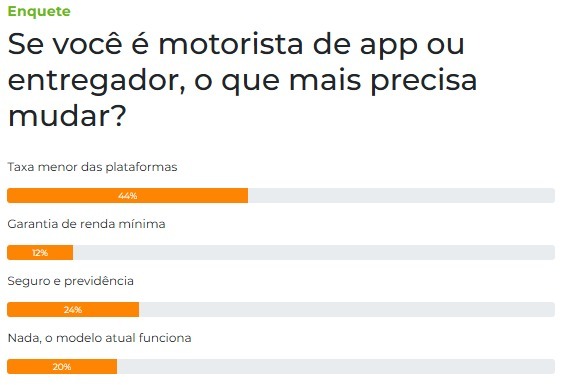Já 24% disseram que o mais importante seria garantir seguro e acesso à previdência, enquanto 20% afirmaram que o modelo atual já funciona. Outros 12% apontaram a necessidade de garantir uma renda mínima para quem trabalha no setor.