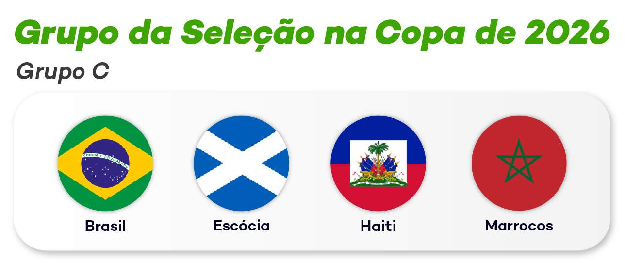 A Seleção Brasileira conheceu seus adversários na Copa do Mundo de 2026, após sorteio realizado em Washington. No Grupo C, o Brasil enfrentará Marrocos, Escócia e Haiti, com estreia marcada para 13 de junho contra os marroquinos. O Mundial de 2026, que será disputado entre 11 de junho e 19 de julho nos Estados Unidos, Canadá e México, marca a primeira edição com 48 seleções e também a primeira vez que três países sediam o torneio simultaneamente.