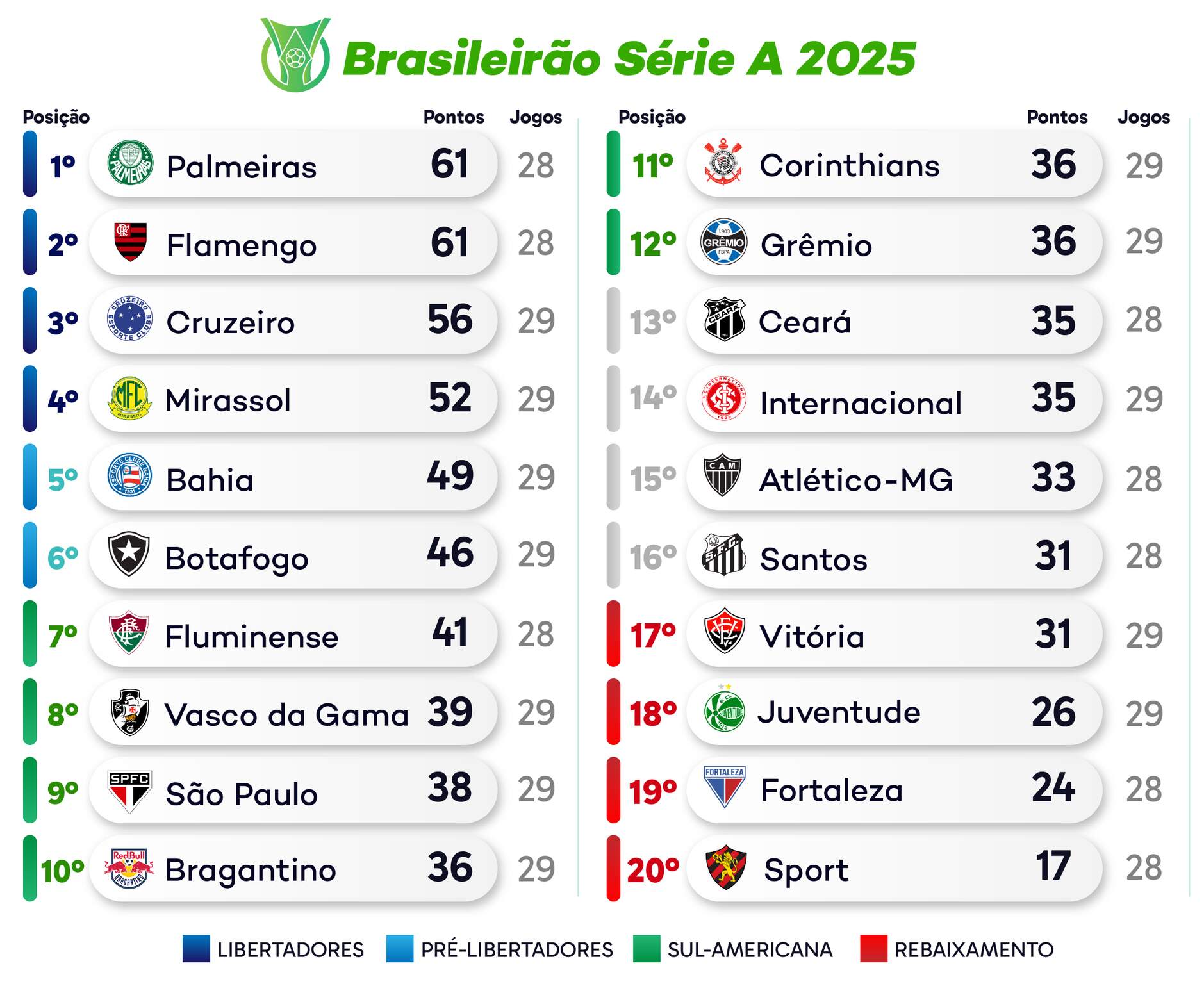 A 30ª rodada do Campeonato Brasileiro tem seis jogos programados para este sábado, com destaque para Corinthians, Flamengo e São Paulo. O Corinthians enfrenta o Vitória em Salvador, enquanto o vice-líder Flamengo visita o Fortaleza no Castelão, e o São Paulo recebe o Bahia no Morumbi.Completam a rodada os confrontos entre Atlético-MG x Ceará, Fluminense x Internacional e Sport x Mirassol. No mesmo dia, a Seleção Brasileira feminina enfrenta a Inglaterra em amistoso preparatório para a Copa do Mundo de 2027, no Etihad Stadium, em Manchester.