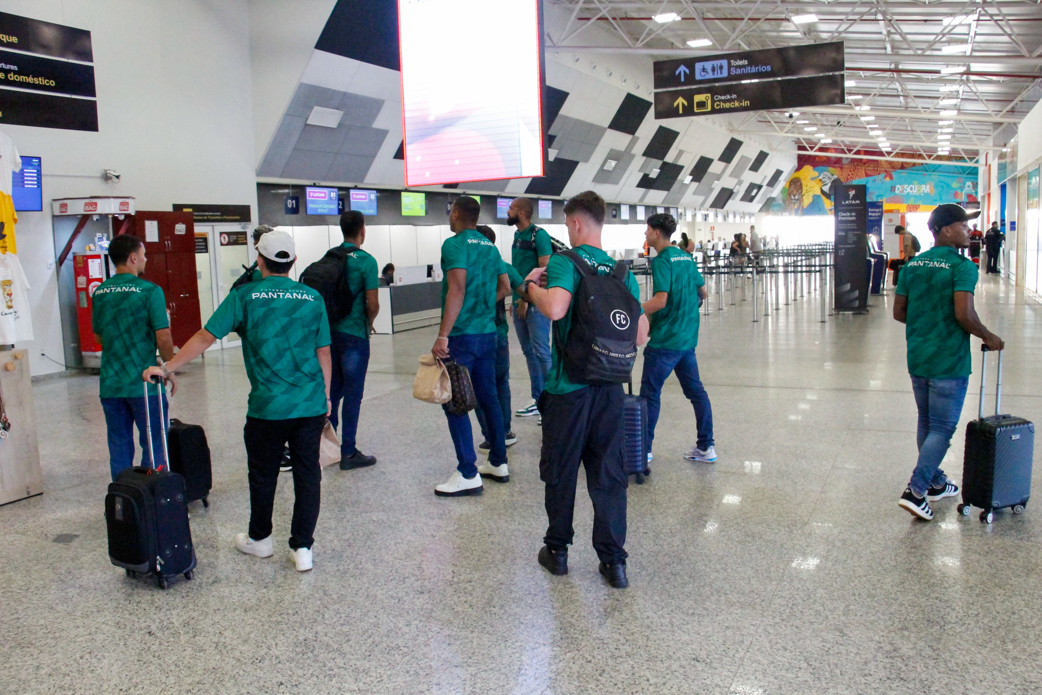 Jogadores do Pantanal no saguão do Aeroporto da Capital (Foto: Juliano Almeida)