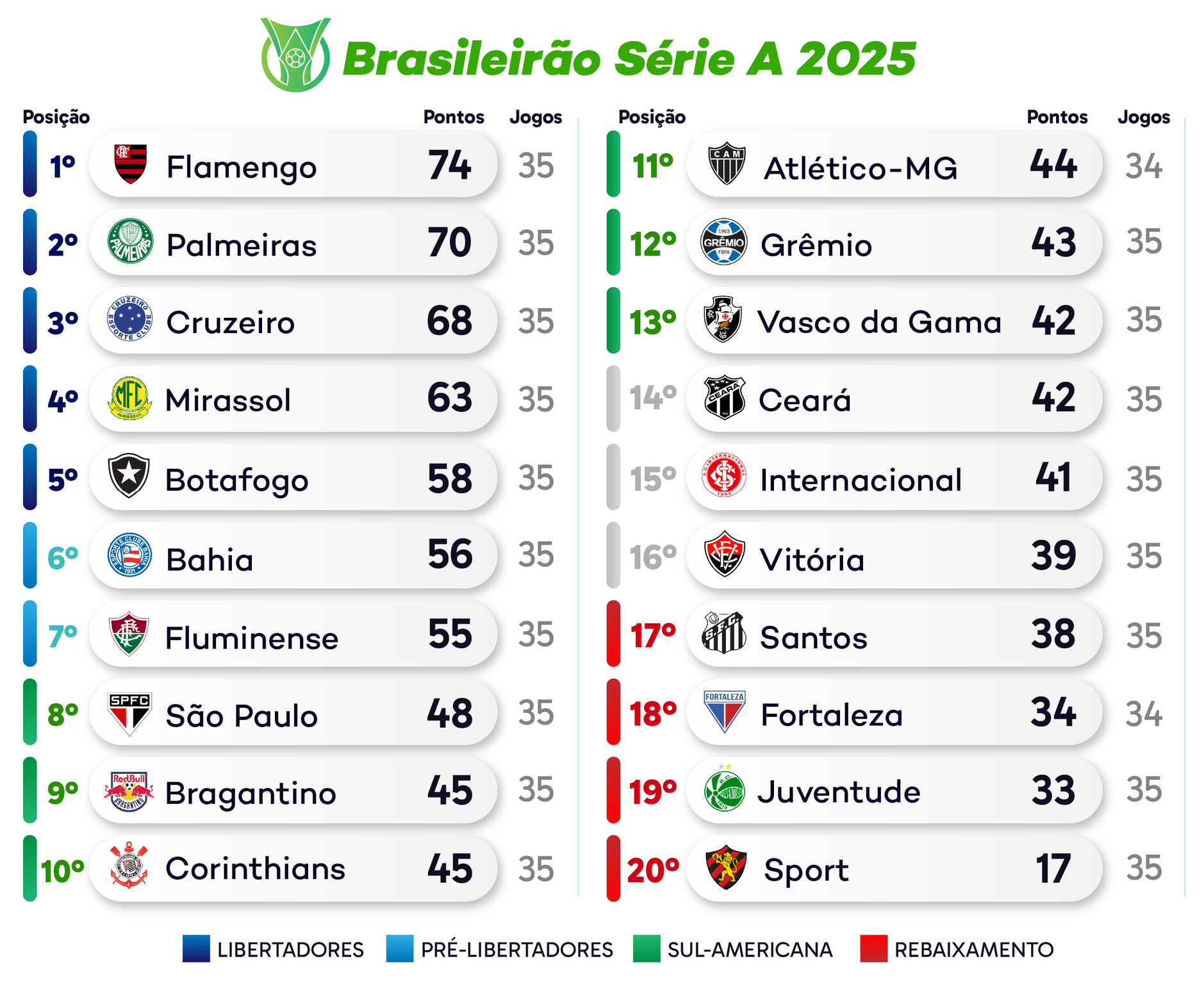 O Flamengo lidera com 74 pontos, quatro a mais que o Palmeiras. Os adversários seguintes do rubro-negro são Ceará e Mirassol. O Verdão fecha o campeonato contra Atlético-MG e Ceará.