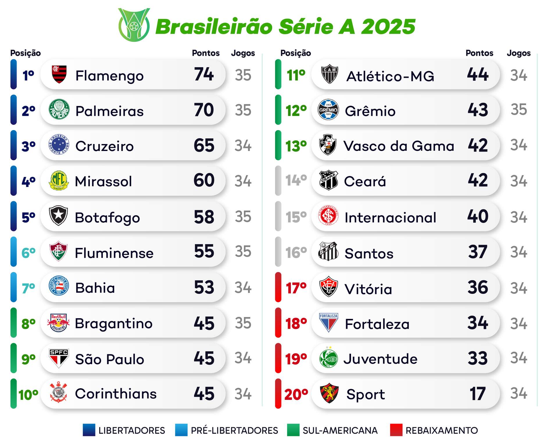 O Brasileirão ainda contará na segunda-feira com Mirassol x Ceará e Internacional x Santos. A partida entre Fortaleza x Atlético-MG está marcada para 30 de novembro.