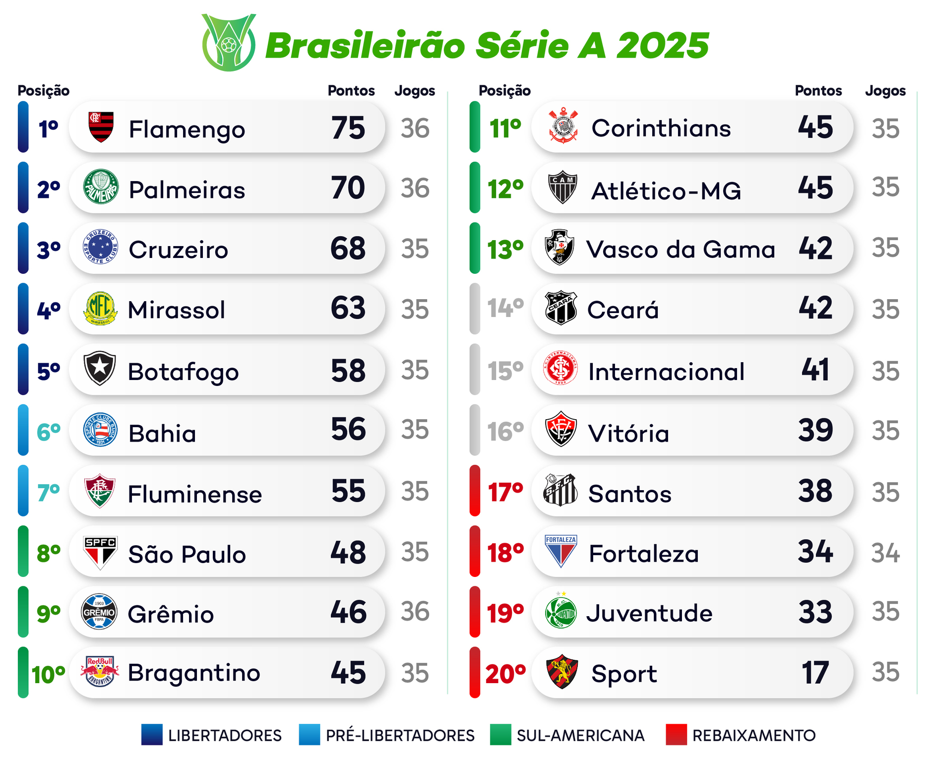 A 36ª rodada do Campeonato Brasileiro prossegue nesta quarta-feira com o confronto entre Red Bull Bragantino e Fortaleza, às 18h, em Bragança Paulista. O time paulista, décimo colocado com 45 pontos, busca vaga na Libertadores, enquanto o Fortaleza luta contra o rebaixamento na 18ª posição. A rodada teve início na terça-feira com empate entre Atlético-MG e Flamengo, e vitória do Grêmio sobre o Palmeiras. Os demais jogos serão realizados entre quinta-feira e domingo, incluindo confrontos importantes como Fluminense x São Paulo e Corinthians x Botafogo.