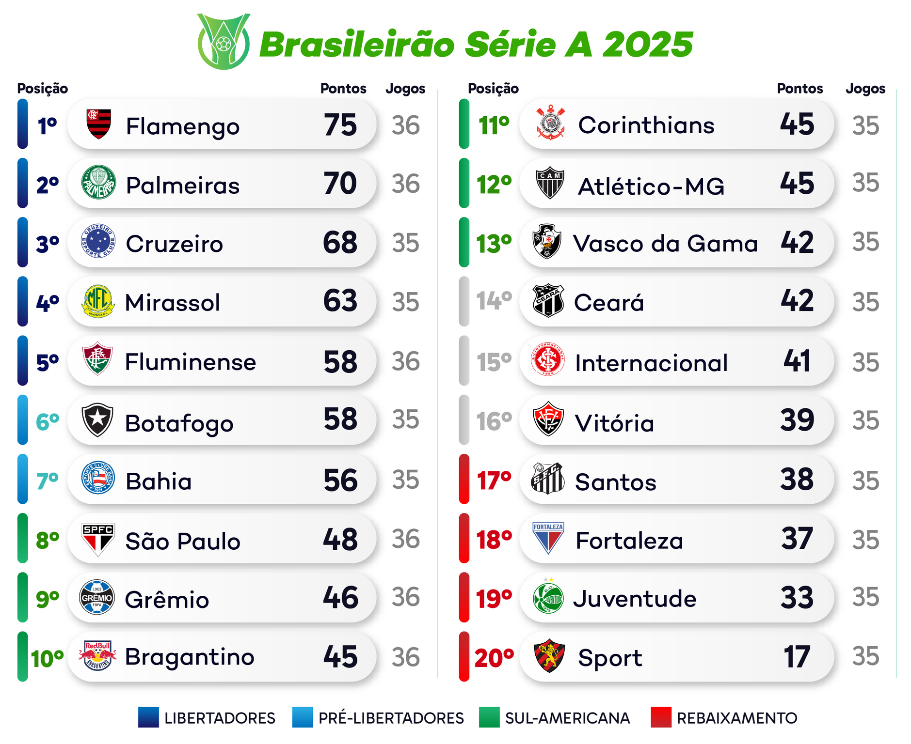 O Vasco entra na rodada ocupando a 13ª colocação, com 42 pontos, quatro acima do Santos, 17º colocado e primeiro integrante do Z4 (zona de rebaixamento). O Colorado é o 15º, com 41 pontos. Às 20h30 tem Santos x Sport no estádio da Vila Belmiro, no litoral paulista.