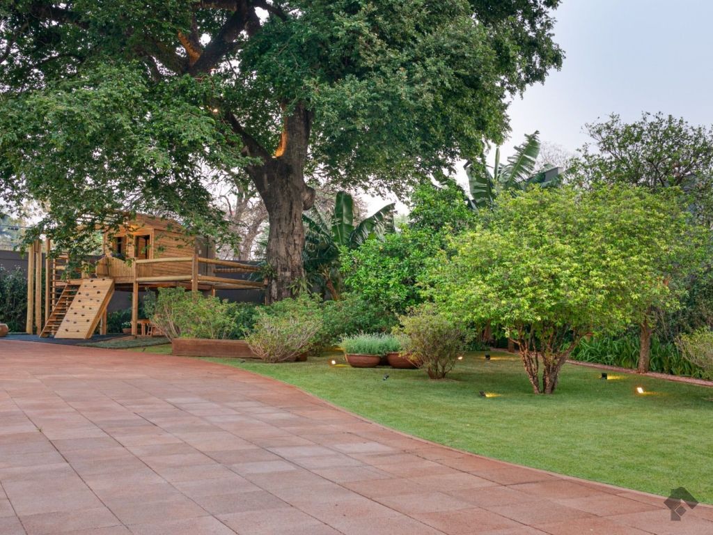 A área de lazer é outro ponto forte. A residência conta com piscina aquecida, sauna, gazebo e um paisagismo cuidadosamente planejado, criando um ambiente que remete a um verdadeiro refúgio urbano. No quintal, um elemento chama atenção: uma árvore centenária cercada por área verde e um espaço especial para as crianças.