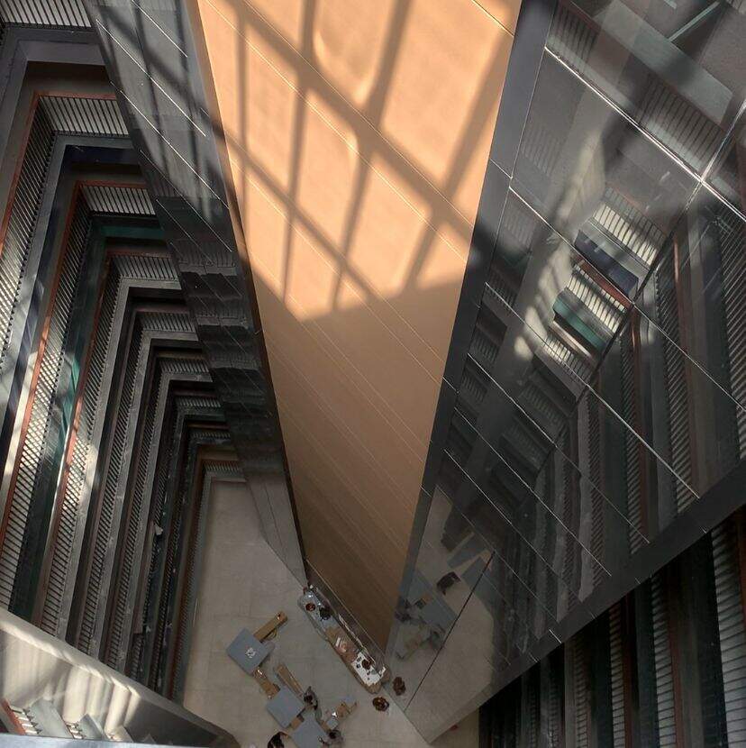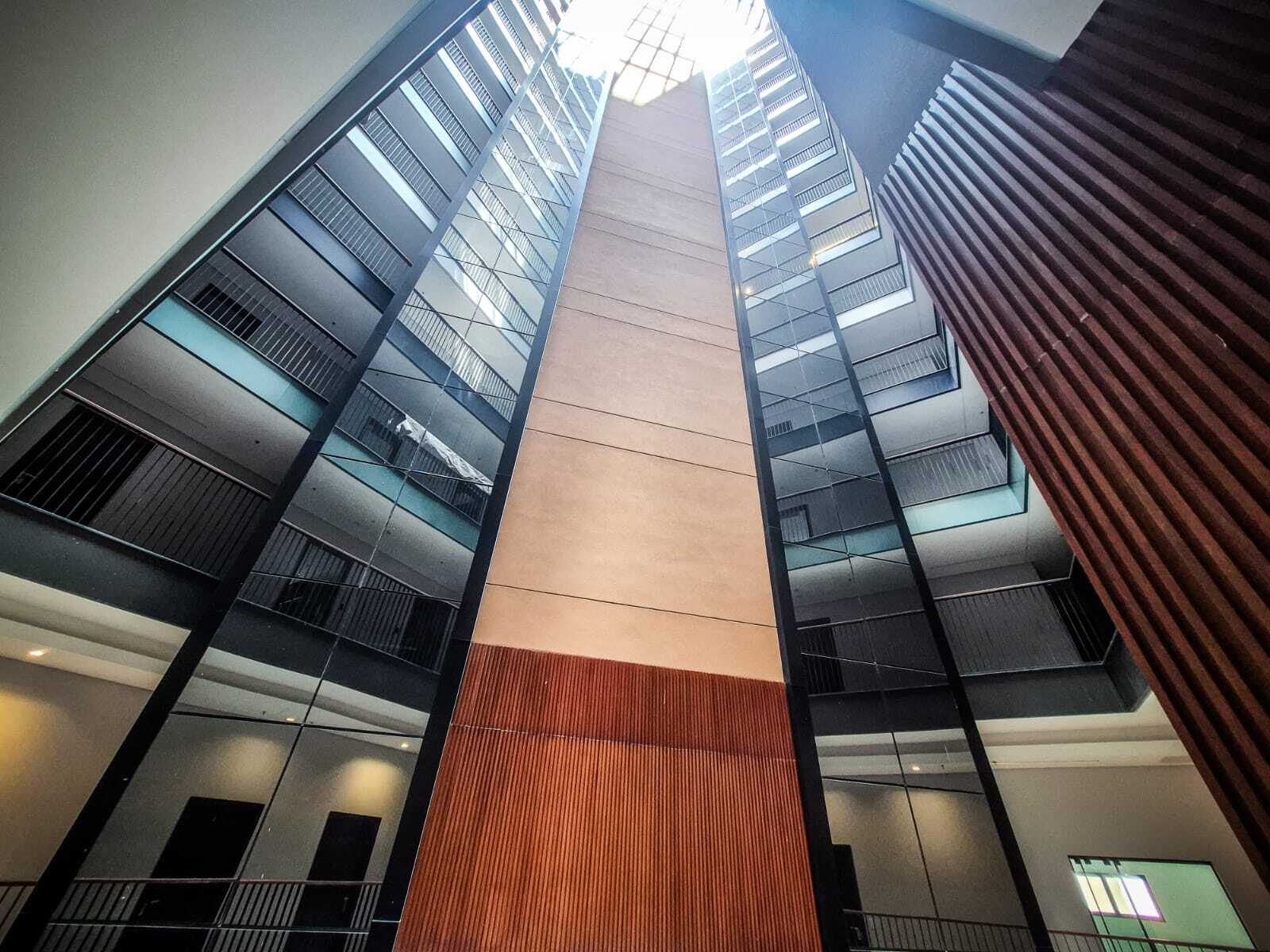 O elevador panorâmico do lado de dentro é um dos diferenciais, porque a graça é olhar para cima e para baixo e só ver escadas. A forma como construíram lembra os hotéis antigos, com andares à mostra.