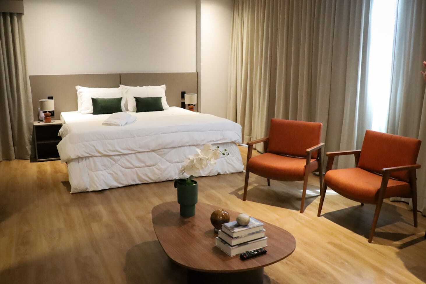 Os quartos foram mantidos e têm 52 metros quadrados. Já o menor tem 27 e o intermediário, 35. O maior contém uma pia, mesa e cadeiras. O objetivo é adicionar sofás ao local. Já os menores não terão tantos móveis, seguem padrão de cômodos de hotéis, mas com decoração em tons terrosos, laranja e verde.