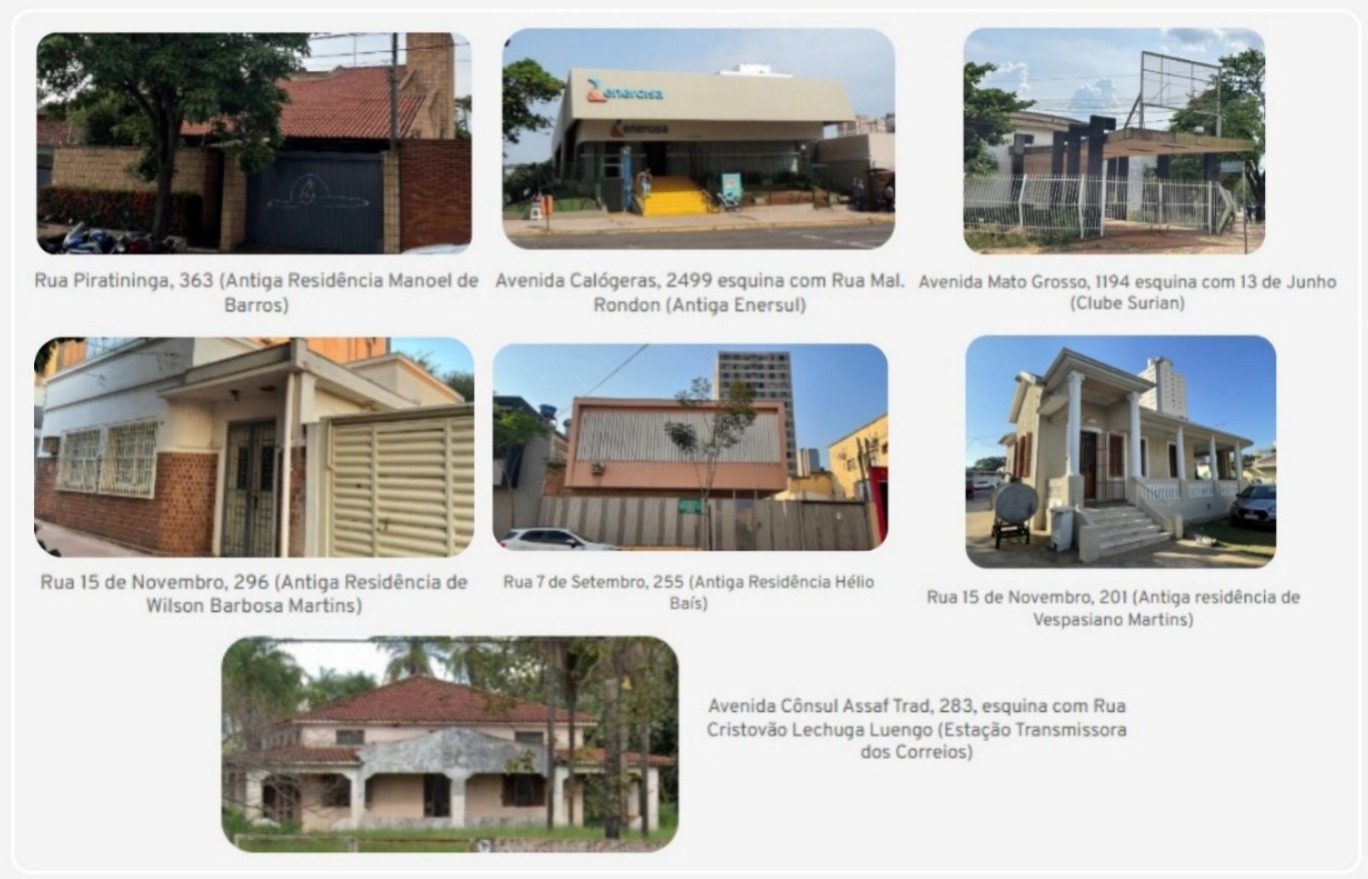 Outro imóvel listado fica na Rua Marechal Rondon, onde funcionou o Consulado do Paraguai. Integra ainda a relação a antiga residência de Wilson Barbosa Martins, na Rua 15 de Novembro, primeiro governador de Mato Grosso do Sul eleito pelo voto popular. A lista inclui também a antiga residência de Vespasiano Barbosa Martins, localizada na Rua 15 de Novembro. Ele foi prefeito da cidade em mais de uma ocasião e atuou como senador.