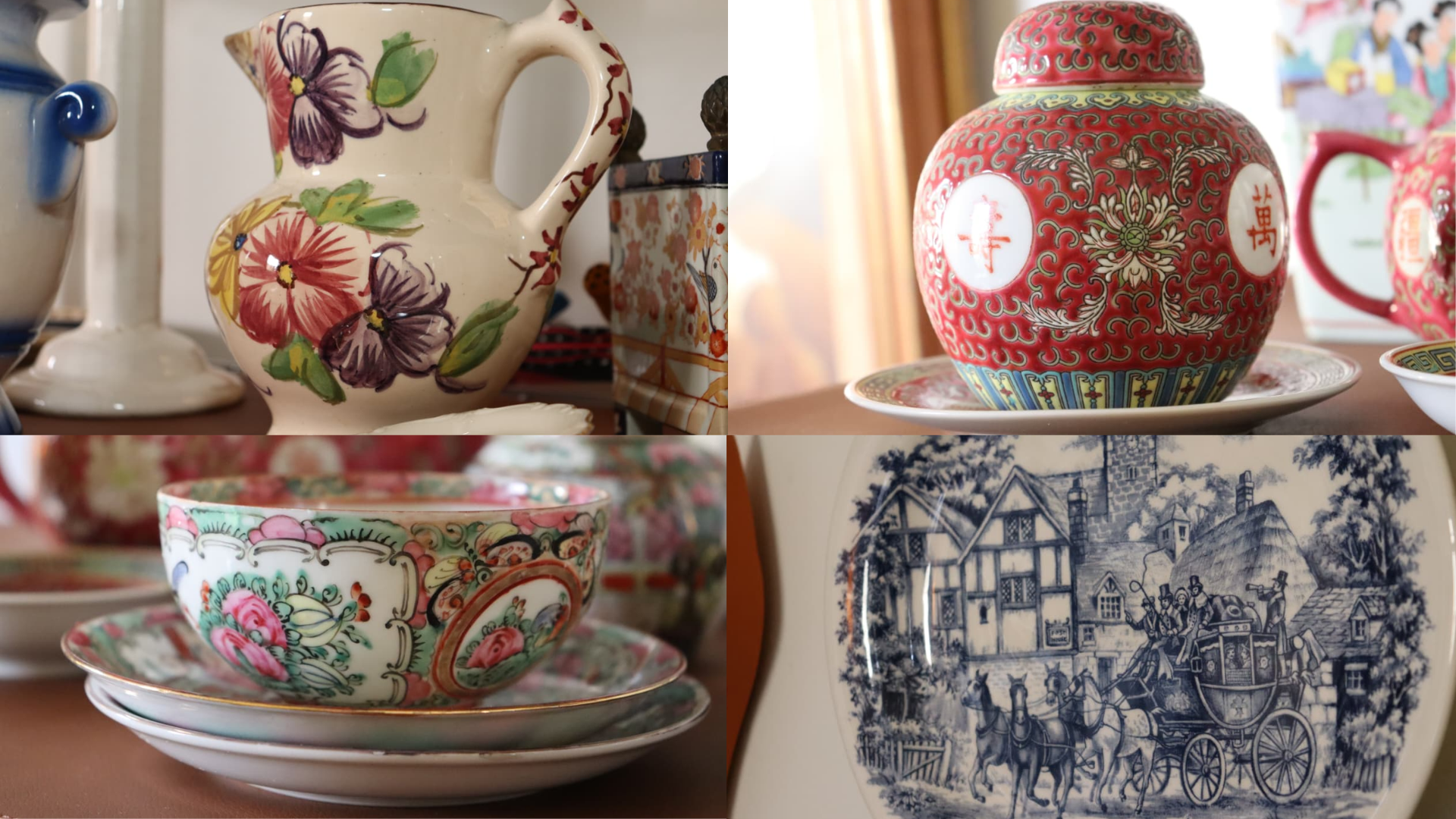 Ali, cada objeto ajuda a construir a atmosfera. Há peças delicadas de porcelana, detalhes em cobre, madeira trabalhada, louças antigas, formas curiosas, pratos decorativos e móveis que parecem saídos de outra época. Algumas se destacam pela raridade, outras pelo desenho, pela textura ou pela sensação de já terem vivido muito antes de chegar ali.