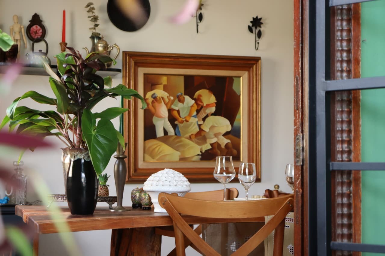 Depois de muito procurar, encontrou a residência antiga que procurava. Aos poucos, foi pintando, organizando, restaurando cantos e trazendo o acervo para dentro. O que era para ser apenas apoio de trabalho acabou virando também um pequeno refúgio.