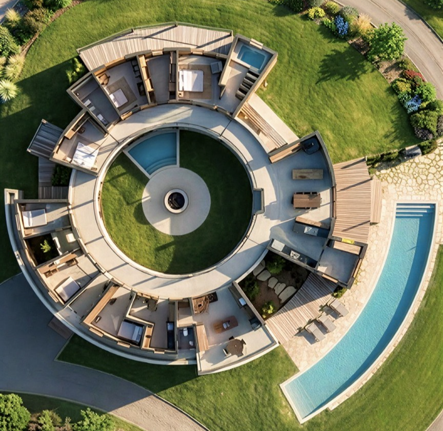 Para ela, a planta circular reforça a ideia de continuidade, pertencimento e equilíbrio. Tudo se articula ao redor do vazio, valorizando o silêncio, a luz natural, a ventilação cruzada.