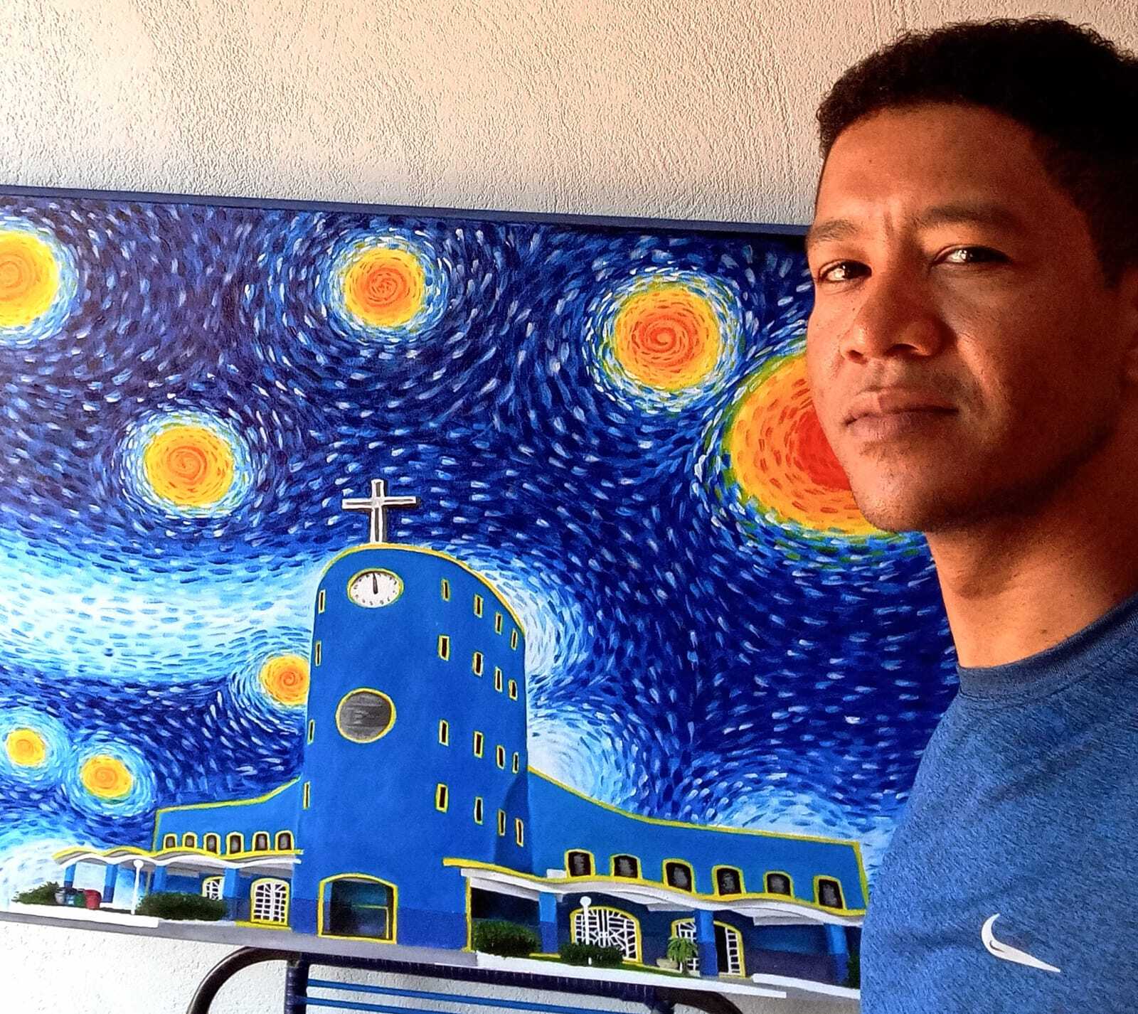 Hoje, além de retratos sob encomenda, ele também investe em obras autorais. Uma das inspirações veio de uma releitura do clássico “Noite Estrelada”, do pintor Van Gogh. A partir daí, Jorge começou a misturar o estilo com elementos locais, inserindo pontos turísticos de Aparecida do Taboado, como a igreja matriz, o portal da cidade e a ponte que faz divisa com São Paulo.