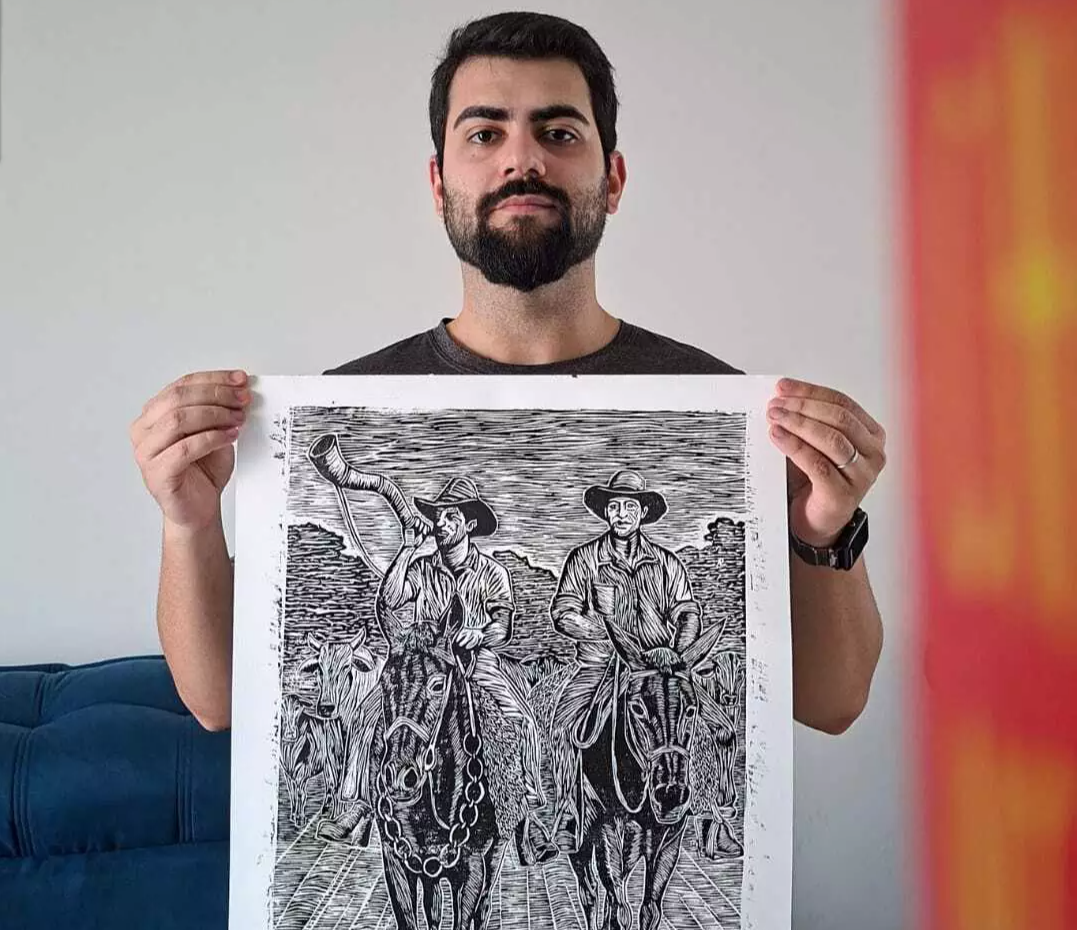 Mesmo longe de casa, o artista sul-mato-grossense Alan Eleutério, de 28 anos, encontrou na arte uma forma de manter vivas as raízes e a identidade cultural de onde nasceu. Natural de Campo Grande, ele mora atualmente em Mogi Mirim, no interior de São Paulo, mas faz questão de produzir xilogravuras que divulguem e exaltem a cultura de Mato Grosso do Sul.