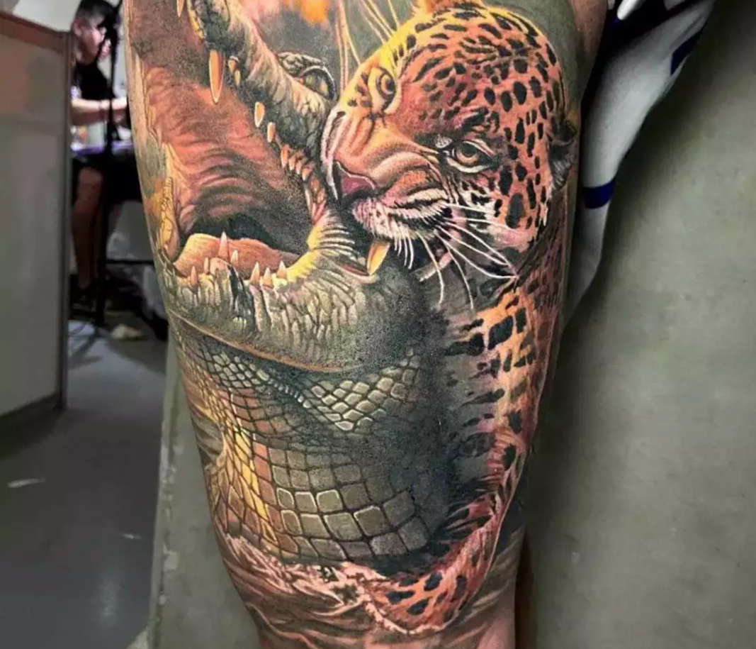 Tatuador impressiona em SP com cena de onça atacando jacaré