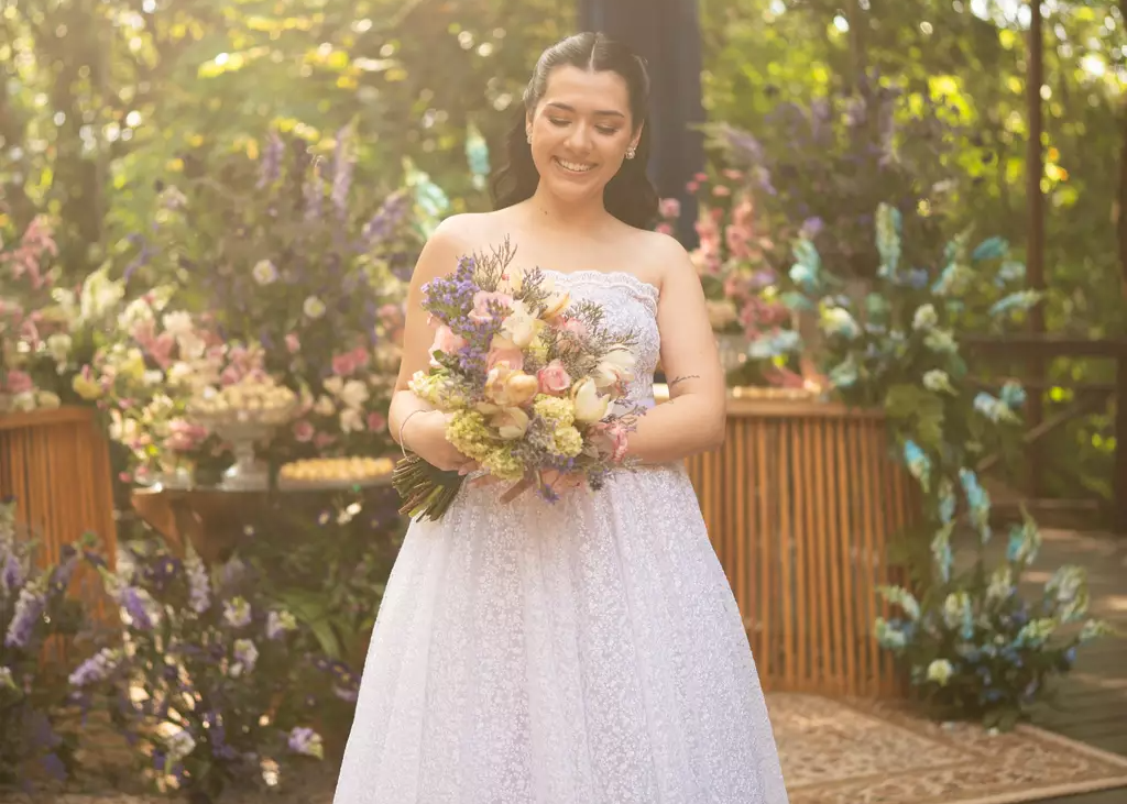 “Diferente das minhas irmas, que os vestidos são cheio de babados, eu queria algo simples e delicado, discretos e poucos acessórios, que refletissem a minha personalidade. Eu só sabia que queria tomara que caia e a saia estilo princesa. A faixa na cintura, o laço que eu coloquei depois para entrar na festa, o véu, fomos vendo conforme eu provava e testando diversas formas.”
