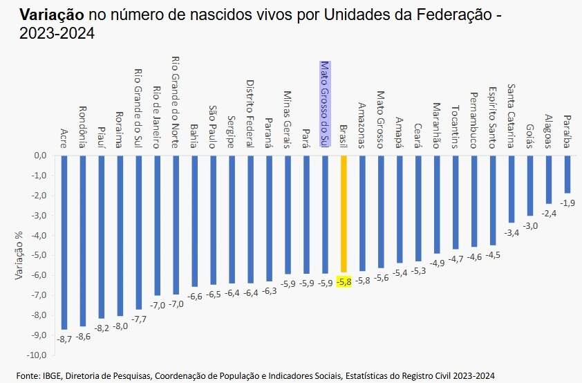 O Estado registrou 37.768 nascidos vivos, número 5,9% menor que em 2023, movimento alinhado à tendência nacional de declínio da fecundidade. A capital acompanhou o ritmo: Campo Grande respondeu por 11.338 nascimentos, também com queda em relação ao ano anterior.