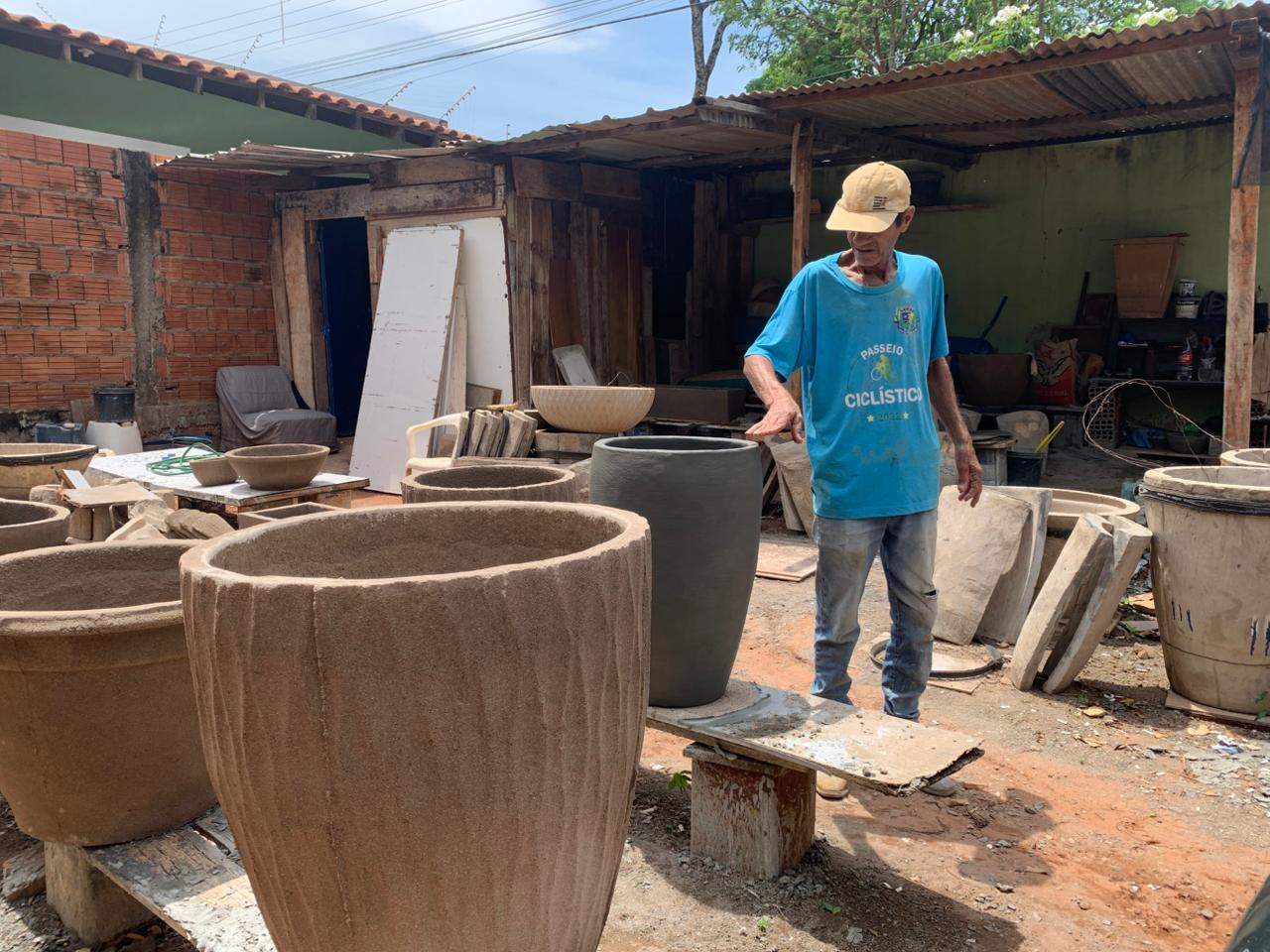 Há dois anos, Juscelino Roberto Batista descobriu que o coração já não era mais o mesmo e que o ofício que salvou seus dias durante 30 anos, dos 78 de vida, não poderia mais ser exercido. Conformado, mas teimoso em continuar fazendo vasos de cimento, a contragosto dos familiares e do médico, Batista, como é conhecido, explica que, além de produzi-los, também já ensinou muita gente. Apesar do problema de saúde, sua dor é não poder mais trabalhar com o que ama.