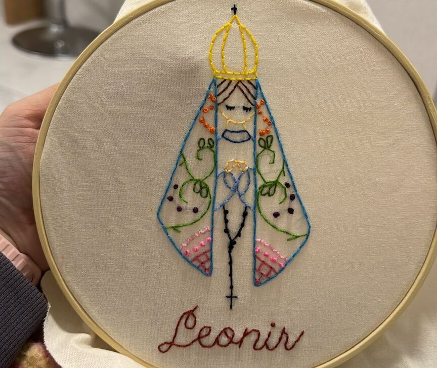 Nesse contexto, o bordado surgiu quase como um encontro. Após pesquisar atividades que pudessem ocupar a mente e ter significado, ela se encantou pela técnica, inicialmente sem grandes pretensões. “Quando comecei a bordar, a ansiedade diminuiu. O tempo passava mais leve e eu conseguia me desligar um pouco do que estava acontecendo ao redor”, diz.