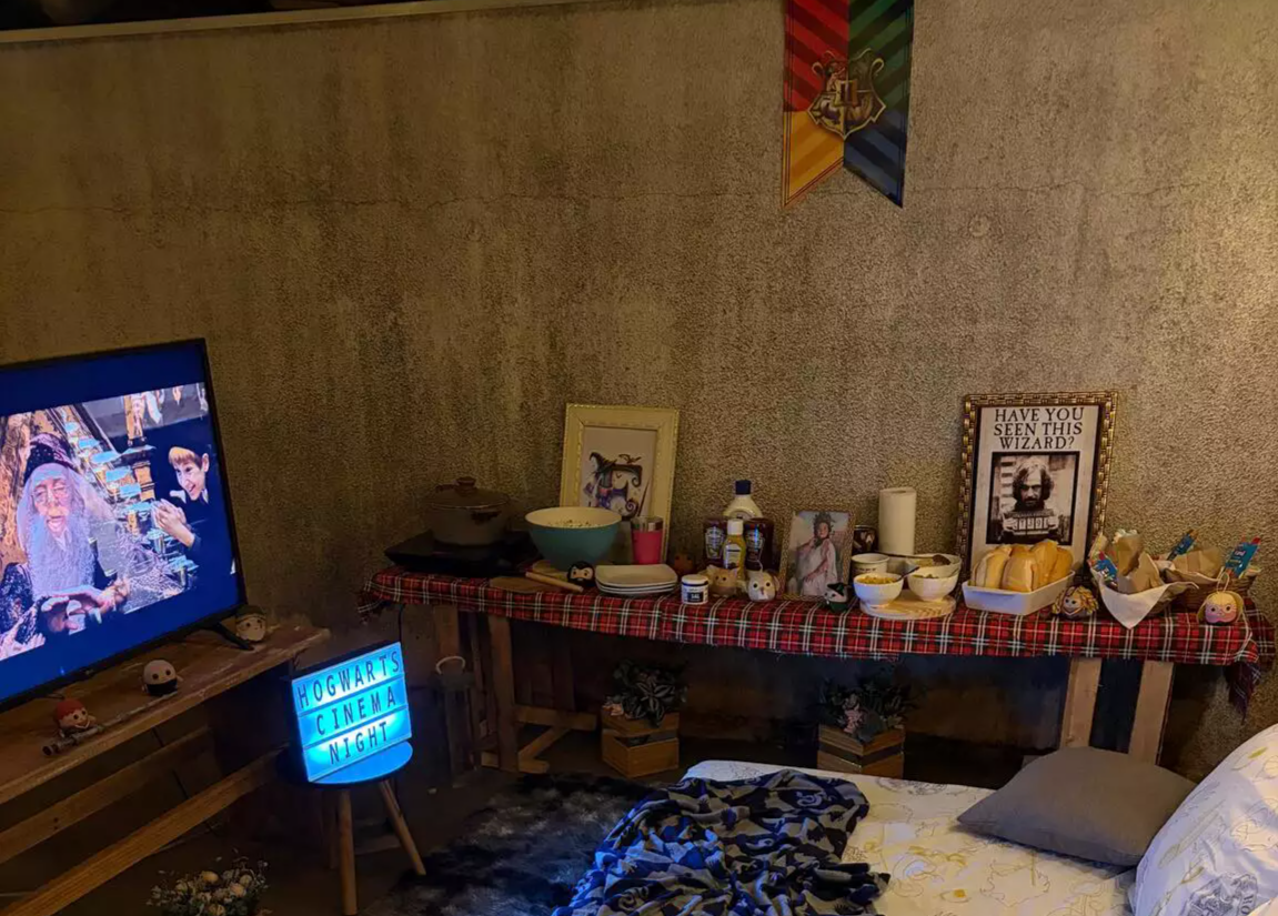 “Eu decorei toda a casa. Fiz cestinha de guloseimas, coloquei marshmallow, pipoca, hot dog, quadros do Harry Potter, almofadas no chão. É todo o ambiente para você entrar no clima”, descreve.