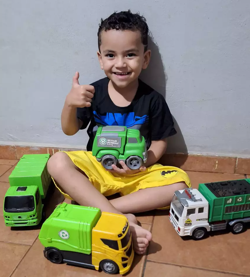 A mãe conta que Miguel tem três caminhõezinhos da coleta, tratores e escavadeiras que sempre ficam espalhados pela casa e durante as brincadeiras tem a frase favorita. “Ele fala que vai dirigir todos”, finaliza.