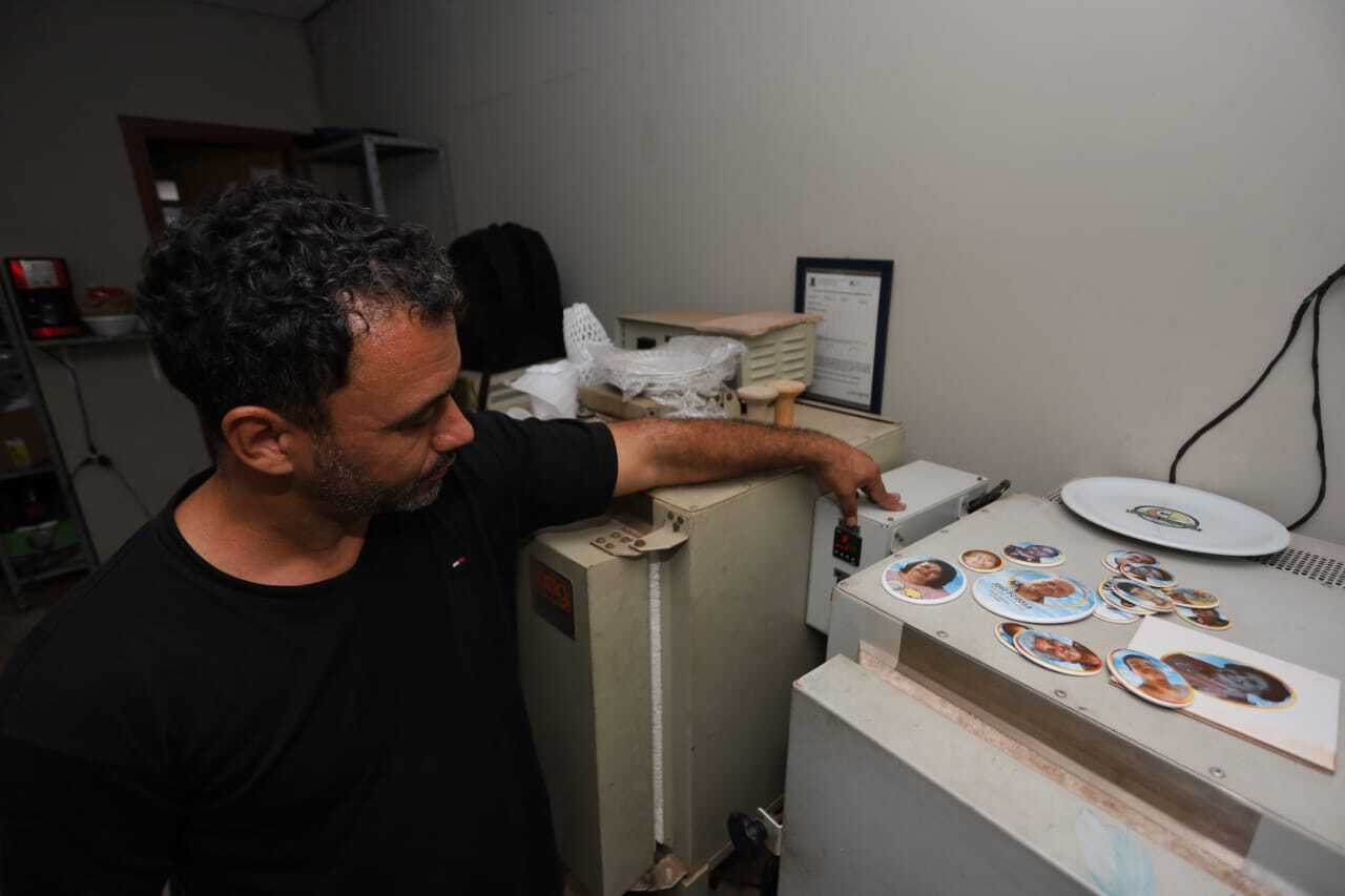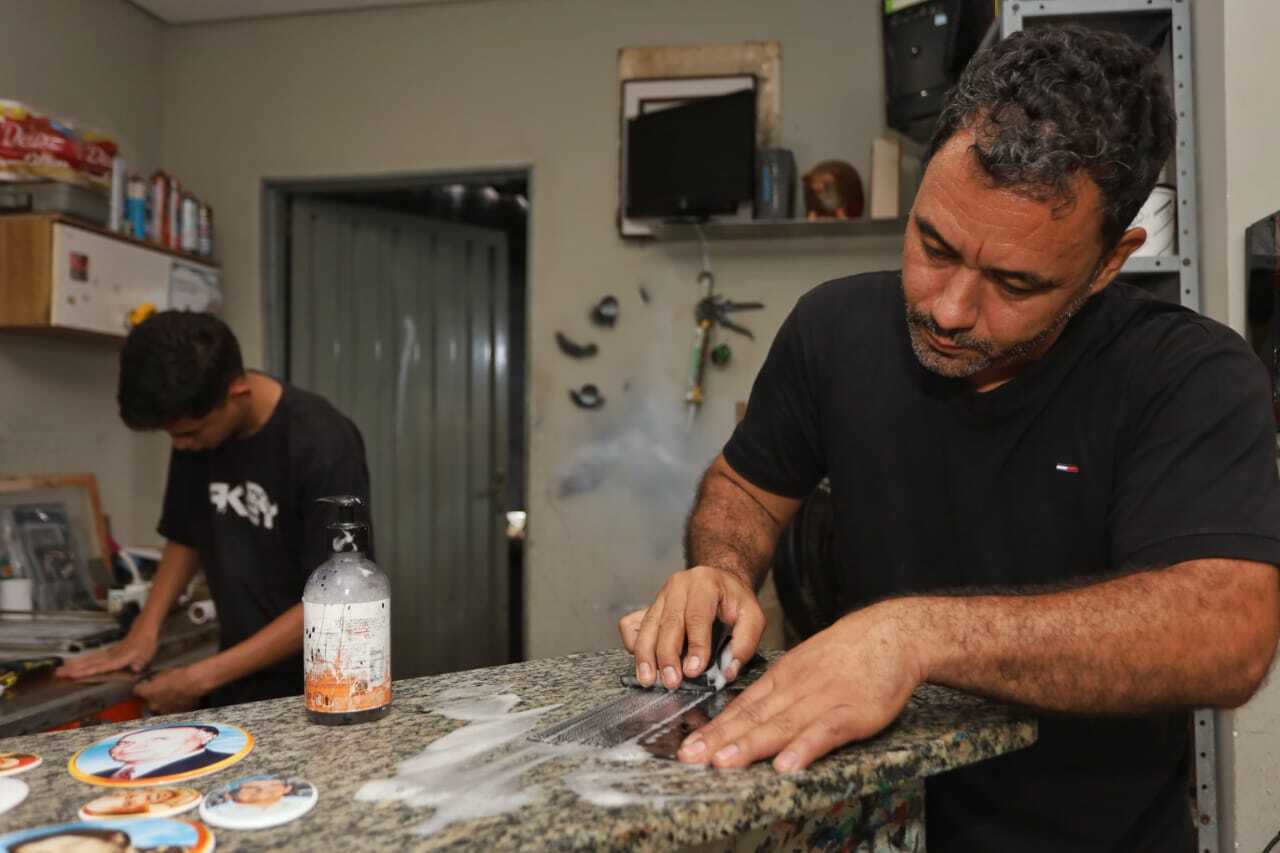Apesar da fama vir do trabalho em cemitérios, o negócio vai além. Ele também faz placas de formatura. O preço começa em R$ 70 e vai até R$ 1.600. O ateliê é pequeno; no espaço há um sofá para descansar nas horas em que monitora o forno e nos minutos livres entre um serviço e outro. Ali, tudo é feito por eles, desde a arte até a fase final da placa.