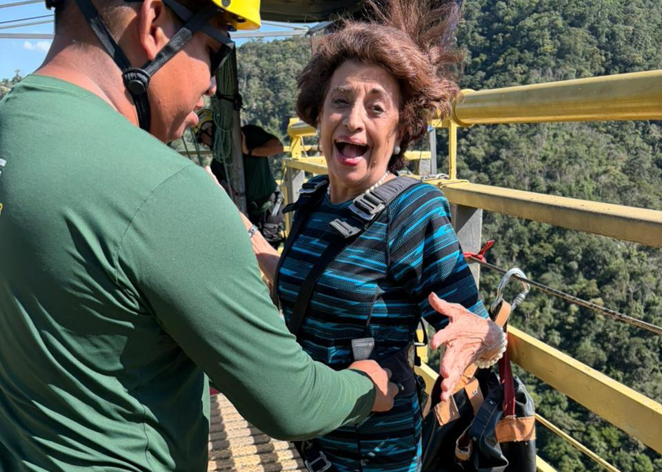 Aventureira encarou o desafio ao lado do neto; o local abriga a maior descida por corda em plataforma do país