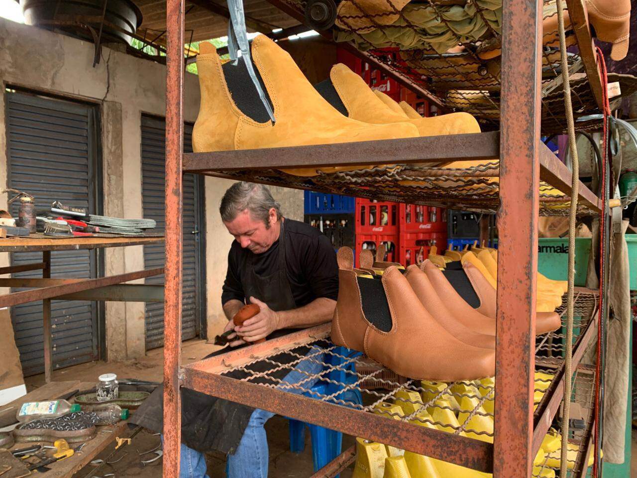 O sapateiro explica que a durabilidade da botina depende do propósito da compra. Se for para uso em fazenda, construção ou mangueiro, dura quatro meses. Se for para outros fins, pode durar anos.