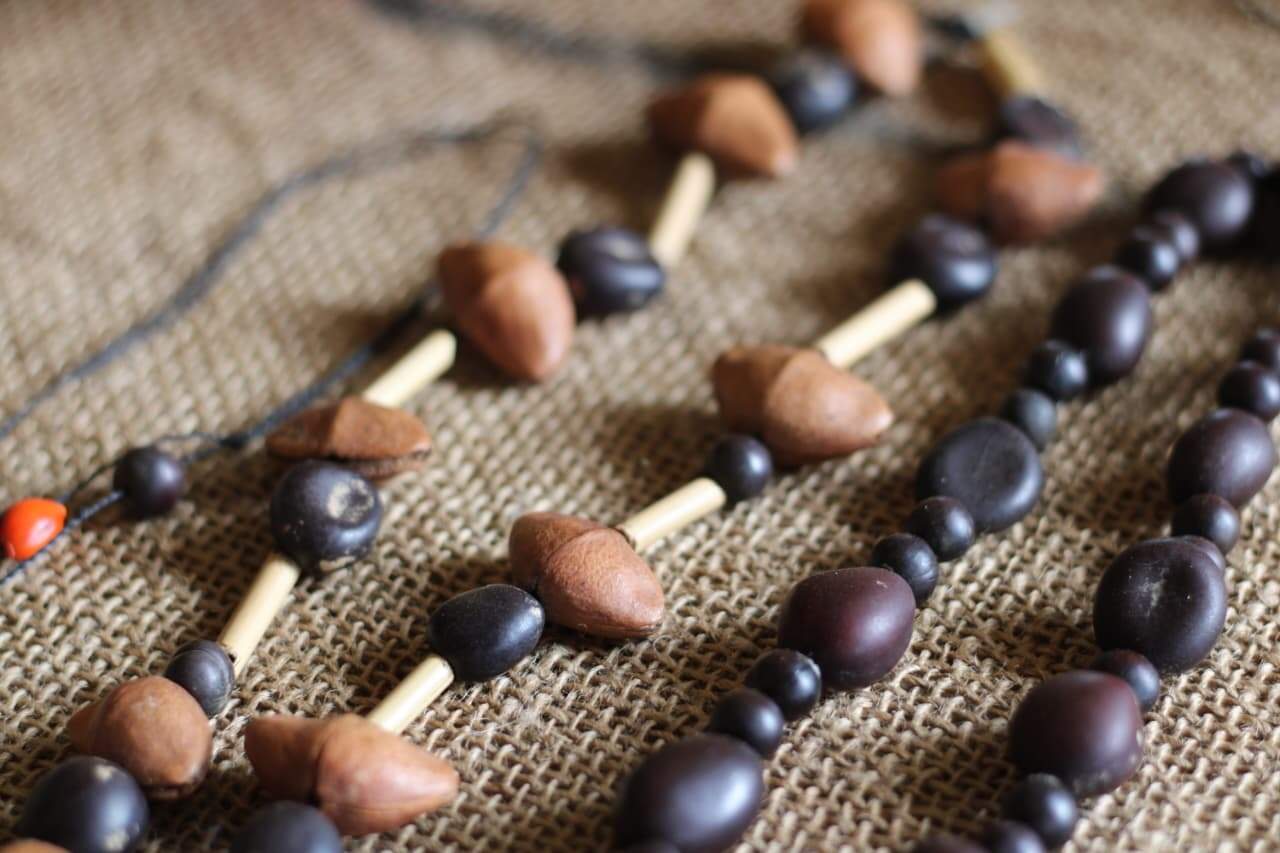 Para fazer as peças, vendidas de R$20 a R$40, dependendo do tamanho, ela usa materiais comuns dos artesãos locais, mas o que muda é a intenção colocada nos materiais. Segundo ela, as sementes vermelhas simbolizam o sangue e afastam o mau-olhado. Já o jatobá é bom para as dores do corpo, ajuda a fortalecer e não dá câimbra. O fruto chamado de “chapéu de Napoleão” é para ajudar a parar o soluço.